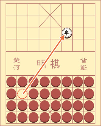 兵・卒・師・将・仕・士 ・相・象・イ車 ・車・イ馬・馬といった駒は、上下左右に1マスずつ動かせ、駒を取る時も、上下左右に1マス動いて、相手の駒を取ります。 |