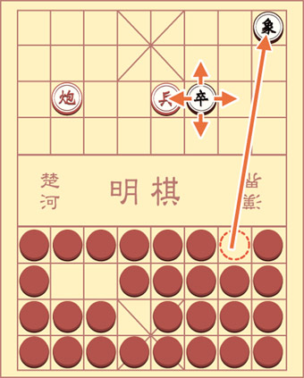 左図では、後手は紅なので、盤面に出ている「黒の卒」は動かせません。ですので、裏返しの駒(紅の火包)を引いて、盤面