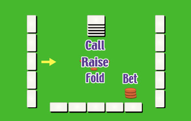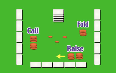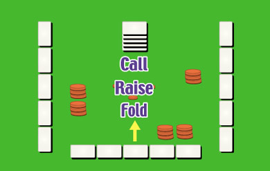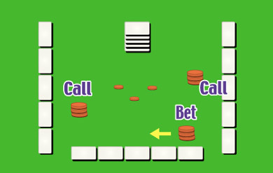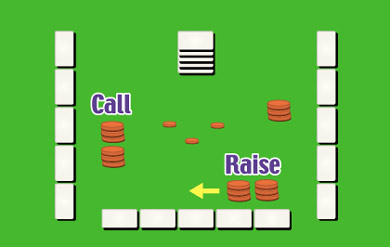 Call・コール 前のプレイヤーと同じ額のベットをすることを、コールといいます。この段階で、 ベットしている全員がCall・コールしたら、次の展開に進みます。 |