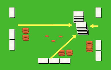 全員がチェックしたら、その場は流れ、中央に置かれたアンティは、次の場に持ち越されます。 次の場もアンティは参加料として必要になるので、前回の分と合わせられます。 以降、アンティは、場が流れれば、その分だけ次回に持ち越され増えていきます。 |