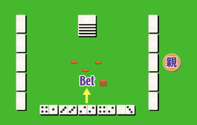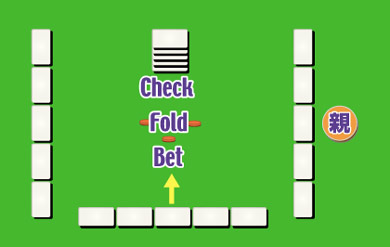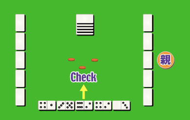 ドミノ牌が5枚配られ、自分の手牌を確認したら、親の左隣のプレイヤーから、「Check・チェック」、「Fold・フォルド」、「Bet・ベット」のどれかをします。 | |