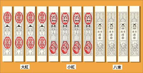 東莞牌の大紅(ダーホン)、小紅(シャオホン)、八束(バーシュー)は特殊札で、主に「百塔(バイダー・どの札にもなる特別 牌)」として使われます。 | ||