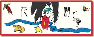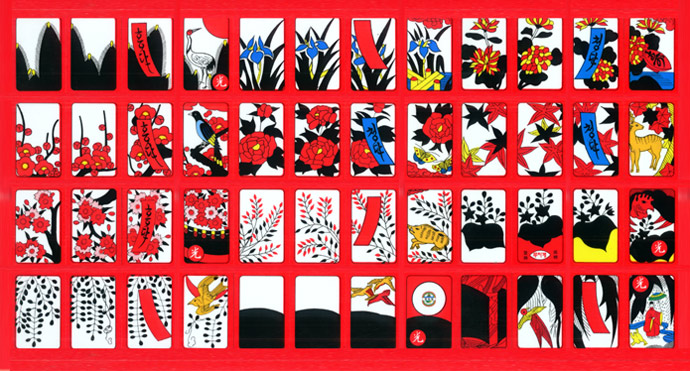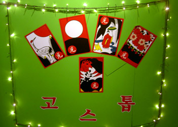 花闘(ファトゥ・Hwatu)は韓国の花札です。日本の花札が、李朝(1392〜1910年)の末期に伝わり、その後の日本統治時代(1910〜1945年)に朝鮮全土に広まりました。現在でも韓国では「三人集まれば必ず花闘をする」といわれるほど盛んに行われており、年齢や階層を問わず幅広く親しまれています。日本の花札との違いも若干見受けられ、花闘(ファトゥ・Hwatu)では、11月の雨札が12月、12月の桐札が11月として扱われます。また日本の花札は裏打ち(絵の裏に紙を貼り合わせて補強する技法)したものが一般 的ですが、韓国の花闘はプラチック素材で作られています。そのほか、光札に光という文字が入っていたり、短冊の文字がハングル表記になっていたり、雨の光札に描かれているのが小野道風ではなく韓国風の人物になっているのが特徴です。 |