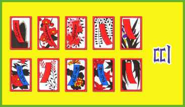 STOP・開始 ■ 親から順番を始めます。 まず親は、 手札の中から一枚を場に出し、同じ月の場札と合わせます。 場札と同月の札が手札にない場合は、 任意の手札を場に一枚だします。合わせた札は、取って持ち札となり、皆に見えるように手元に並べておきます。 |