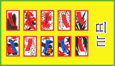■ミンファトゥ・開始 ■ 親から順番を始めます。 まず親は、 手札の中から一枚を場に出し、同じ月の場札と合わせて取ります。 場札と同月の札が手札にない場合は、 任意の手札を場に一枚だします。 合わせて取った札は、持ち札として、皆に見えるように手元に並べておきます。 |