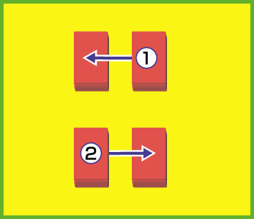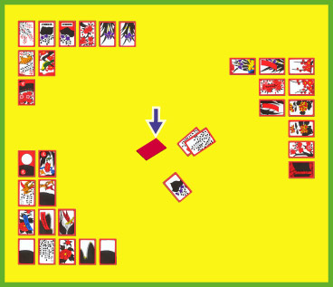 ■ミンファトゥ・手順■ 親の後、子も同じように手札から一枚出し、同月の場札に合わせて取り、山札から一枚引き、同月の場札を取っていくという手順を繰り返します。 順番は親から右側に廻っていきます。 |