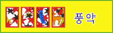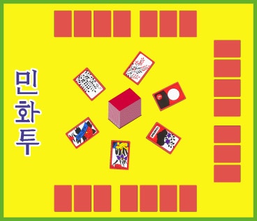 『ミンファトゥ』は、韓国に花札が流入した時代より遊ばれているルールです。日本の花札の「花あわせ(馬鹿っ花)」系のルールとほとんど共通 しており、出来役を「ヤク」と呼ぶなど日本式の名称も残されています。また、 役も少なく、韓国に花札が流入してからずっと遊ばれているルールなので、お年寄りから子供まで幅広い世代に親しまれております。ミンファトゥのミンは韓国語で「飾り気のない 」という意味で、「ミンファトゥ=飾り気のない花闘(ファトゥ) 」という意味を表します。 人数は2人〜3人まで遊べ、2人の場合は「場札に8枚」・「手札に10枚」、3人の場合は「場札に6枚」・「手札に7枚」ずつ配ります。 |