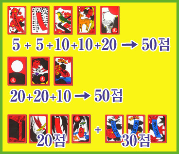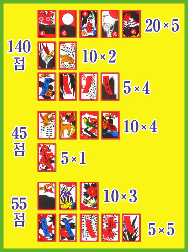札をすべて取り終えたら得点計算に入ります。まず役の点数を各自数え、その点数分の札を他のプレイヤーから貰います。 「草役(チョヤク)・楓役(プンヤク)・ピヤク(雨役) 」は 20点、「紅短(ホンダン)・青短(チョダン)」は30点となります。 その点数分の札を、手持ちの「光札(20点札)・タネ札(10点札)・短冊札(5点札)」から精算します。 それが済んだら、各自、札の合計得点を算出します。 |