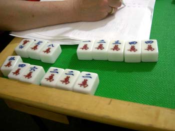 対局した香港人姐さんの十三幺聴牌。一索が来れば危うく完成していた。 |