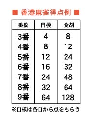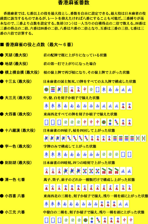 香港麻雀の基本的な規則として、まず日本の麻雀が1翻以上ないと上がれないように、3点以上の点数がないと上がることができない。 役の数は番という単位で表すので、上がるには3番以上が必要になる。 荘の決め方、配牌の方法、牌数、雀頭、刻子や順子の揃え方などは日本麻雀と同じであるが、ドラが存在しないので、ドラ牌を開示することはない。 また、リーチ、フリテンがないので、自分が捨てた牌でも上がることができる。 荘の連荘はなく、ノーテン罰符もない。 王牌は残さず最後の一枚までツモをする。捨て牌は自分の前に並べずに、河の中に無造作に捨てる。 日本麻雀では東場・南場の半荘戦だが、香港麻雀では東南西北すべての風場を行う。 鳴く時は、「ポン」は同じで、槓は「ガン」、チーは「上(ション)」、ツモは「自模(ジーモ)」、ロンは「食胡(セッグ)」と発声する。 暗槓の時はすべて裏向きにして場に出す。点数は純粋に役の点を足して計算される。 香港麻雀は上がり牌の種類が少なく、古い形の麻雀に属するといわれており、現代の広東麻雀の基礎にもなっている。 |