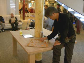 生野区の巽公園を後にし、大阪港より釜山行きの大型客船・パンスターフェリーに乗り込む。船内は、九割以上が日本観光からの帰路に就く韓国人で占められていた。大阪港を離れ、しばらく船内を散策した後、人が集まるロビーで劉朗さんと早速チャンギを対局。すると、どこからともなく多くの人達が集まって来て、我々の対局を観戦し始めた。 |