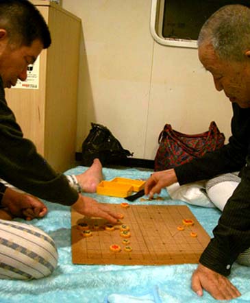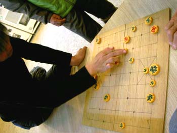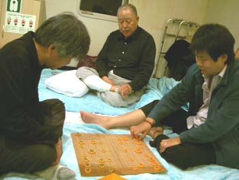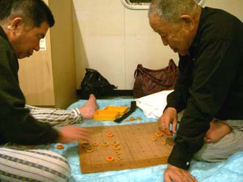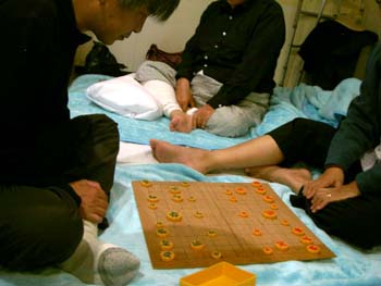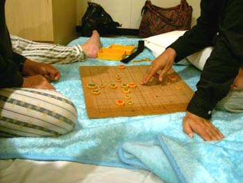 何局か対局を続けていると、見物していたある韓国人のお年寄りが、自分の部屋で友達とやりたいから貸してくれと声を掛けてきた。後程、そのお年寄りの部屋に行き、本場韓国人同士の対局を観戦する。やはり子供の頃より嗜んでいるだけあって、駒の動かし方が自然であり、打つ手も鋭さが感じられる。 |