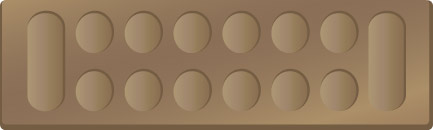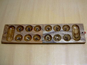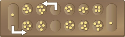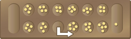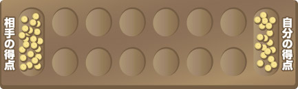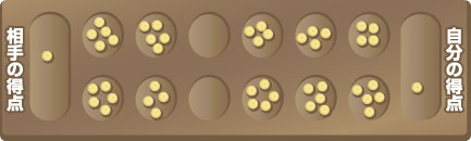 両端の2つの大きな窪みに1つずつ入った豆が得点となります。右側が自分の得点、左側が相手の得点となります。 | |