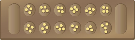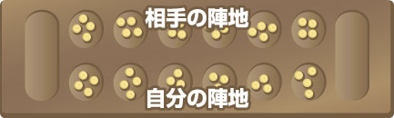 手前の6つの穴が自分の陣地で、 向いの6つの穴が、相手の陣地となります。 | |